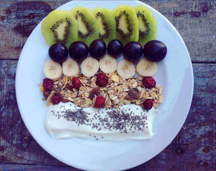 Frutas naturales con un poco de avena, yogur natural, frutos rojos deshidratados, semillas de chía y una cucharadita de miel pura